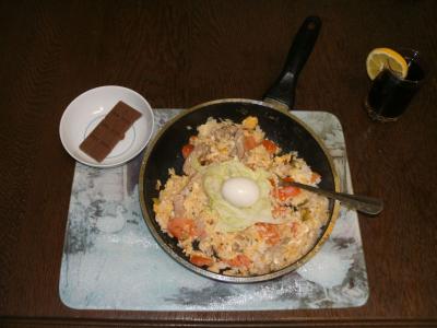 Reispfanne mit: Reis (von heute Mittag), Scheinefleischstreifen, Tomaten, Käse, Oliven, Salz Pfeffer und 3 Eiern. In der Mitte sehr ihr ein gekochtes Ei von gestern auf einem Salatblatt. Foacking delicious!