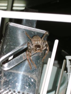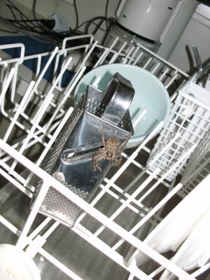 Gestern abend in meiner Küche (ich war bestimmt schon einige Male dicht an ihr vorbeigelaufen, ohne sie zu bemerken) fiel sie mir dann doch ins Auge. Sie hatte sich (für ein weibliches Wesen) von meiner Ignoranz ziemlich unbeeindruckt gezeigt und nichts getan um meine Aufmerksamkeit auf sich zu ziehen. Und selbst als ich sie entdeckt und Photos von ihr gemacht hatte, rührte sie sich nicht. Vielleicht hat sie auch geschlafen, ich weiss es nicht. Sie saß da nur ganz friedlich auf meinem Gemüsehobel am Rande, des ganzen anderen sauberern Geschirrs.