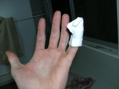 Es war einmal in einem fernen Land, in dem sich ein junger Bursch an der Arbeit versuchte. Dabei schnitt er sich an einem scharfkantigem Teil einer 200l Tonne mehrere milimeter in den kleinen finger der linken hand. Nachdem das erste pflaster unbrauchbar geworden war, behalf er sich mit Klopapier und tesafilm.