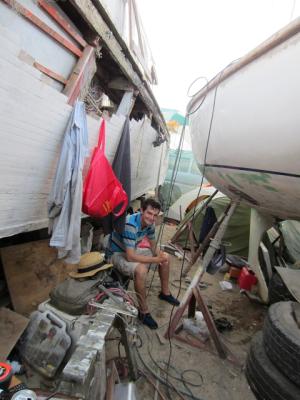Er ist ein prima Zeitgenosse und reist mit seinem Fahrrad durch Australien. Wohlgemerkt Australien, wo man auch mal hundert Kilometer Straße ohne einen Rastplatz mit McDoofnalds haben kann. Noah hatte sich in Townsville ein Boot gekauft. (jaja, wie lustig, wahrscheinlich ist er gerade in Australien unterwegs um Tierpärchen zu suchen). Das Boot war zwar sehr günstig, dafür aber auch nicht richtig seetauglich. Seit ein paar Monaten ist er dabei, dass zu ändern. Das Boot steht momentan bei einer Werft, er arbeitet Tagsüber im Abrissgewerbe und abends an seinem Boot, in dem er mittlerweile auch lebt.