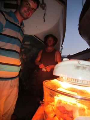 Hier warten wir auf Hühnchen, das im Garer ist: