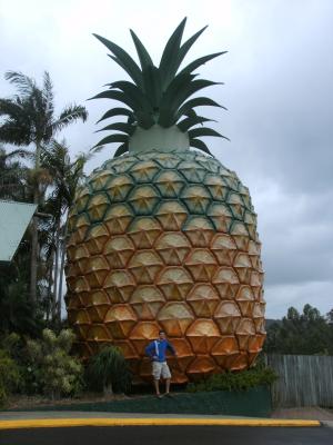 Ich vor der großen Ananas irgendwo nördlcih von Brisbane. Letztens bin ich an der großen Banane in Coffs Harbour vorbei gefahren. Es gibt auch die große Erdnuss, die große Garnele, die große Mango usw. :