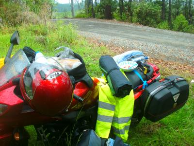 Erstmal war ich so aufgeregt und zufrieden mit meinem Gefährt , dass ich ziel- und planlos durch die Stadt fuhr, ohne zu wissen wo ich hin wollte/musste. Nach ca. 10 Minuten suchte ich mir dann den Highway Richtung Norden und los gings. Nach ungefähr einer Stunde Fahrt, fing es dann sehr zu meinem Missfallen an zu regnen und ihr könnt euch vorstellen, dass Regen auf einer Motorradtour mit Zelt noch blöder ist, als mit dem Auto. Das hat drei Gründe: Im Auto macht man bei Regen den Scheibenwischer an, auf dem Motorrad macht man bei Regen erstmal nichts…außer Regentropfen auffangen und so langsam durchzuweichen und sich von ganzem Herzen wünschen es möge doch bald aufhören.