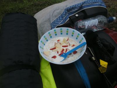 Naja, mit der sehr verlockenden Erwartung in meine klammen und nassen Klamotten steigen zu müssen, stand ich dann irgendwann auf und frühstückte, baute mein Zelt ab und organisierte meine Sachen.
